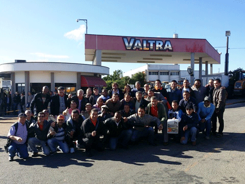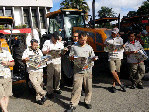 ![]() Trabalhadores da Valtra lêem jornal do sindicato |