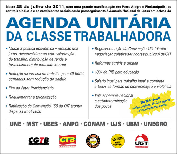 Agenda Unitária da Classe Trabalhadora contempla os seguintes itens: