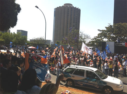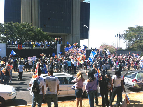 A manifestação de hoje começou em frente ao Banco Central e segue em passeata, com mais de 20 mil participantes, até o Congresso Nacional. Ela faz parte de uma série de manifestações feitas pelos movimentos sindical e social em todo o País, desde julho, em defesa da “Agenda Unitária da Classe Trabalhadora”.