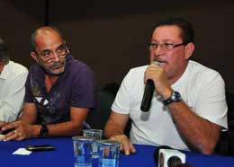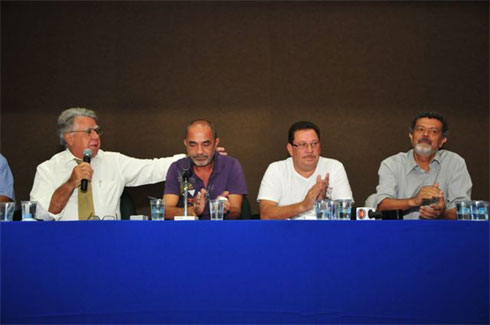 ![]() Veloso, Advogado do Sindicato, secretário-geral Arakém, diretor Teco e diretor Cláudio Prado |