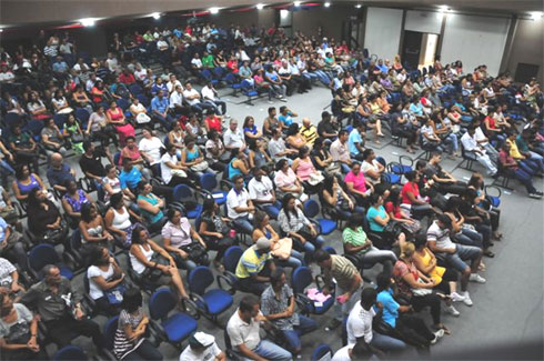 Muitos trabalhadores trouxeram a família para a reunião. Eles estão sem receber salários, abono e fizeram uma greve de 18 dias, que foi encerrada após o acordo no TRT.
