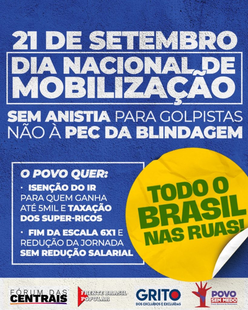 Todo o Brasil nas ruas neste domingo, 21 de setembro: contra a PEC da Blindagem e Sem Anistia para Golpistas! Em São Paulo: 14h no MASP