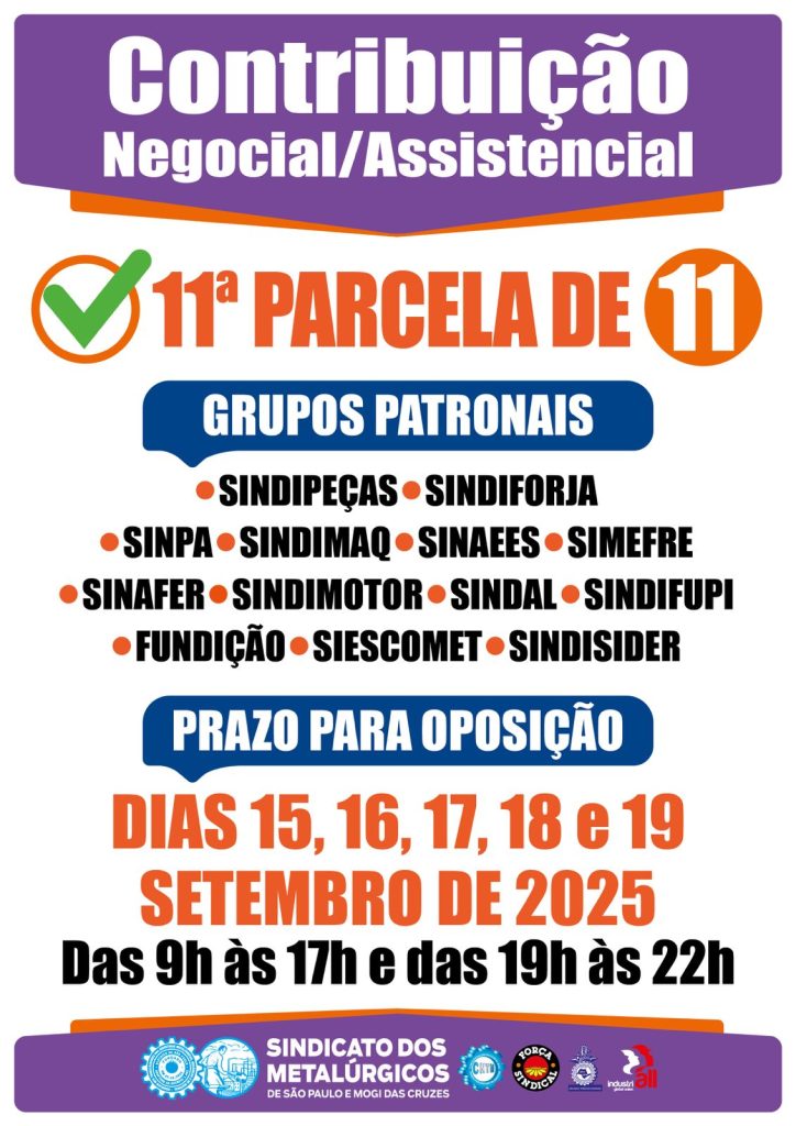Será na sexta-feira, 26 de setembro de 2025, às 17h, a Assembleia da Campanha Salarial, na sede do nosso Sindicato, Rua Galvão Bueno, 782, Liberdade, próximo ao metrô São Joaquim. Na ocasião, vamos apresentar para a nossa categoria a pauta de reivindicações aprovada pelos 54 sindicatos filiados à Federação dos Metalúrgicos, representando mais de 700 […]