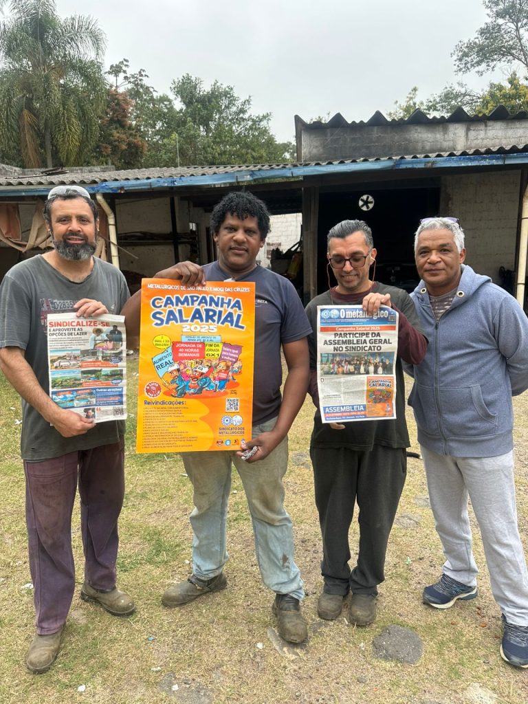 Trabalhadores da Alumikit, base da diretora Ester, exibem o cartaz da Campanha Salarial 2025