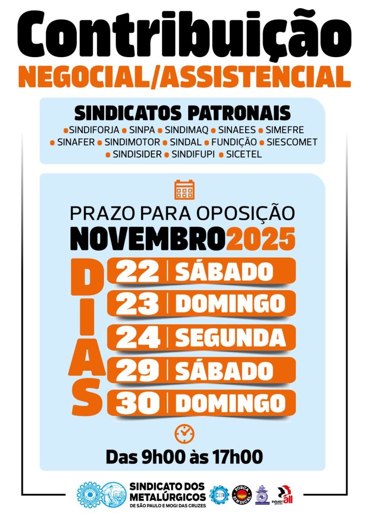 Prazo de entrega para cartas de oposição à contribuição negocial/assistencial O Sindicato dos Metalúrgicos de São Paulo e Mogi das Cruzes, fundado em 27 de dezembro de 1932, sempre lutou pela democracia, liberdade de expressão e pelos direitos dos trabalhadores. Para a consecução de tais objetivos, imperativo estabelecer condições adequadas, isto é, fontes de custeio […]