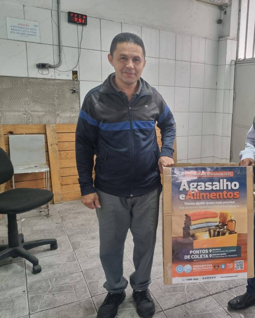 Trabalhador da ZILMER, base do diretor Ortiz, com cartaz da campanha do agasalho/alimentos