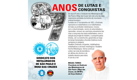 Miguel Torres Temos muito orgulho de nossa origem operária e da missão de, como dirigentes sindicais, defender os interesses da Família Metalúrgica e da classe trabalhadora em geral. E com este mesmo orgulho lembramos que nesta data, 27 de dezembro de 2019, o nosso Sindicato dos Metalúrgicos de São Paulo (e Mogi) completa 87 anos. […]