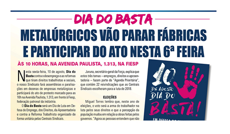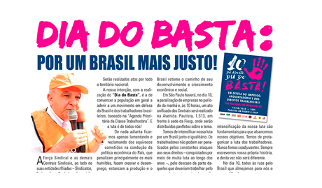 A Força Sindical e as demais Centrais Sindicais, ao lado de suas entidades filiadas – Sindicatos, Federações e Confederações –, irão promover, na próxima sexta-feira, dia 10 de agosto, em unidade de ação, o “Dia do Basta – Em Defesa do Emprego, da Aposentadoria e dos Direitos Trabalhistas”. Os atos acontecerão por todo o território […]