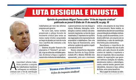 Jornal O GLOBO PUBLICA OPINIÃO DE MIGUEL TORRES sobre O TEMA “O FIM DO IMPOSTO SINDICAL”