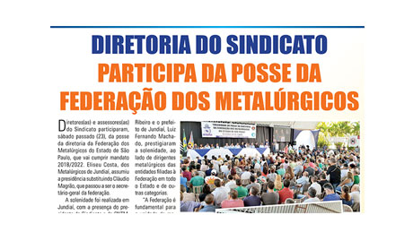 A nova diretoria da Federação dos Metalúrgicos do Estado de São Paulo (FedmetalSP) tomou posse no sábado, 24 de fevereiro, para o mandato 2018/2022. Eliseu Silva Costa, presidente do Sindicato dos Metalúrgicos de Jundiaí, Várzea e Campo Limpo, tomou posse como presidente da Federação, substituindo Cláudio Magrão de Camargo Cre, que passou a ser o secretário-geral da […]