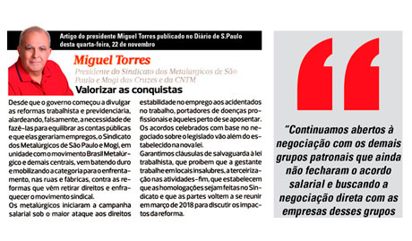 Desde que o governo federal começou a divulgar as reformas trabalhista e previdenciária, alardeando, falsamente, a necessidade de fazê-las para o equilíbrio das contas públicas e dizendo que as reformas iriam gerar empregos, o Sindicato dos Metalúrgicos de São Paulo e Mogi das Cruzes, em unidade com o movimento Brasil Metalúrgico e centrais sindicais, vem […]