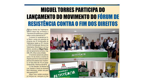 O presidente do Sindicato dos Metalúrgicos de São Paulo e Mogi das Cruzes e da CNTM, Miguel Torres, participou nesta terça-feira (5), em Brasília, do lançamento do “Movimento de Resistência Por um Brasil Melhor e contra o desmonte da CLT”. O movimento foi lançado durante o Fórum Sindical dos Trabalhadores (FST), que reúne 22 confederações de […]