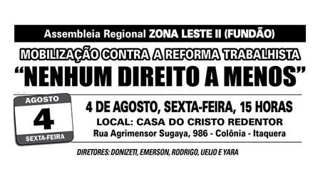 Os diretores e diretoras do Sindicato dos Metalúrgicos de São Paulo e Mogi das Cruzes e suas equipes continuam convocando os trabalhadores metalúrgicos para assembleias regionais de resistência às reformas que tiram direitos da classe trabalhadora. Já foram realizadas assembleias regionais em Mogi das Cruzes (20 de julho); na zona norte da capital (21 de […]