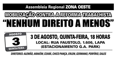Assembleia de resistência às reformas nesta 5ª feira, na zona oeste