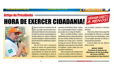 Estamos vivendo um momento único do País, que exige o exercício pleno da cidadania pelo fortalecimento a democracia, da soberania nacional, da participação nas decisões políticas em todas as instâncias de poder, educação e saúde de qualidade, garantia dos direitos trabalhistas e aposentadoria digna. No dia 24 de maio o movimento sindical vai realizar uma […]
