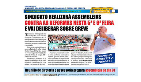 Ouça a entrevista do secretário-geral do Sindicato, Arakém, na quarta, 29 de março, à Rádio Agência Sindical https://soundcloud.com/radioagenciasindical/metalurgicos-de-sp-se-mobilizam-contra-reformas-neoliberais