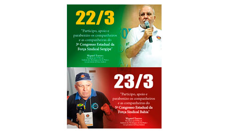 3º Congresso Estadual da Força Sindical Sergipe Será realizado nesta quarta, 22, o 3º Congresso Estadual da Força Sindical de Sergipe, com a participação de Miguel Torres, presidente do Sindicato dos Metalúrgicos de São Paulo/Mogi das Cruzes e da CNTM (Confederação Nacional dos Trabalhadores Metalúrgicos) e vice-presidente da Força Sindical. O evento será realizado no […]