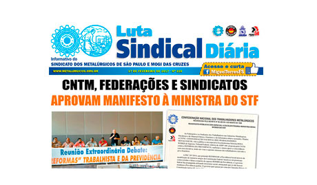 Na sexta, 17, em Reunião Extraordinária da diretoria executiva da CNTM, para debate sobre as reformas trabalhista e previdenciária e a estratégia para resistir às ameaças aos direitos dos trabalhadores, representantes dos sindicatos e federações de metalúrgicos participantes aprovaram um manifesto à ministra Rosa Weber, do Supremo Tribunal Federal, reafirmando o apoio e concordância com […]