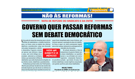 Nota de repúdio “A discussão de temas tão relevantes para a vida de milhões de trabalhadores e cidadãos brasileiros, agora e no futuro, como os projetos das reformas trabalhista e previdenciária, exige uma discussão muito ampla, transparente e, sobretudo, democrática. O governo, contudo, quer aprovar suas reformas a toque de caixa, sem muito diálogo com […]