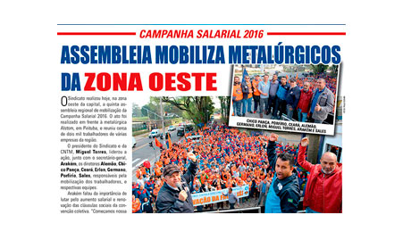 O Sindicato realizou hoje (1/9), na zona oeste da capital, a quinta assembleia regional de mobilização da Campanha Salarial 2016. O ato foi realizado em frente à metalúrgica Alstom, em Pirituba, e reuniu cerca de dois mil trabalhadores de várias empresas da região. O presidente do Sindicato, Miguel Torres, comandou a assembleia, junto com o […]