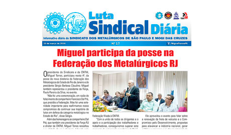 O presidente do Sindicato e da CNTM, Miguel Torres, participou nesta quarta-feira (23), da solenidade de posse dos novos diretores da Federação dos Metalúrgicos do Estado do Rio de Janeiro e do presidente Sérgio Barbosa Claudino. Miguel Torres também representou o presidente da Força, Paulo Pereira da Silva, no evento. “O momento não é festa […]
