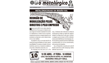 O Sindicato dos Metalúrgicos de São Paulo realiza nesta sexta-feira, 10 de abril, às 18h, a sexta reunião regional de mobilização da categoria para as lutas e ações sindicais de 2015 e discussão das medidas provisórias que tiram direitos trabalhistas. A reunião será na zona sul, com trabalhadores metalúrgicos das fábricas da região, na Quadra […]