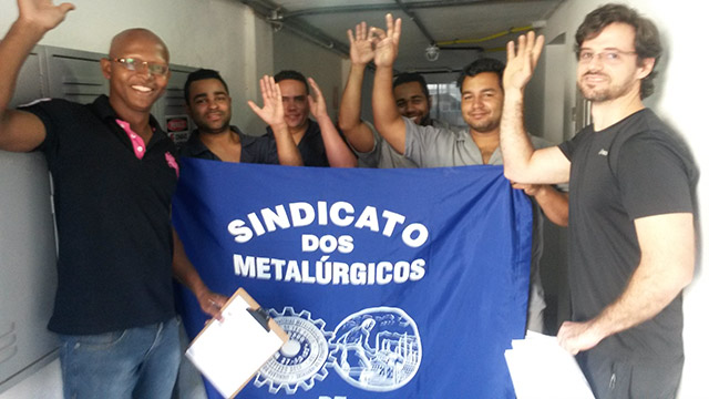 O diretor sindical Erlon Lorentz comandou, nesta quarta-feira (4), a assembleia de aprovação do acordo da PLR de 2015 na Sondeq, na zona oeste da capital. Os trabalhadores vão receber o benefício em duas parcelas, em setembro/15 e março/16. A mobilização contou com apoio dos assessores Isaac Gabriel, Vinicius Vieira e Eduardo.