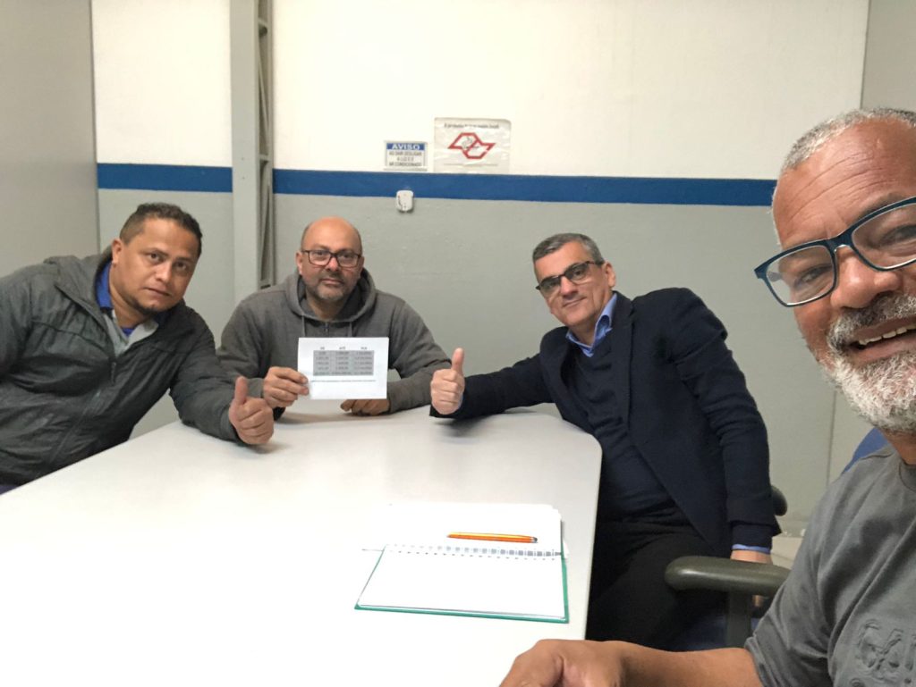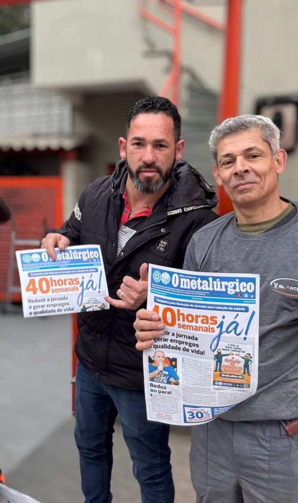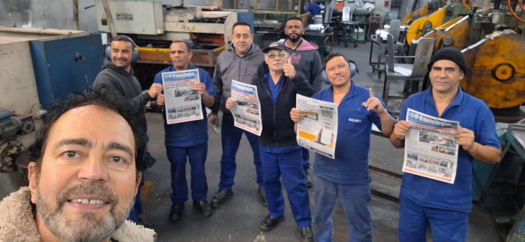 Companheiros da Antelecom, base do diretor Teco, com o jornal O Metalúrgico na luta pela redução da jornada