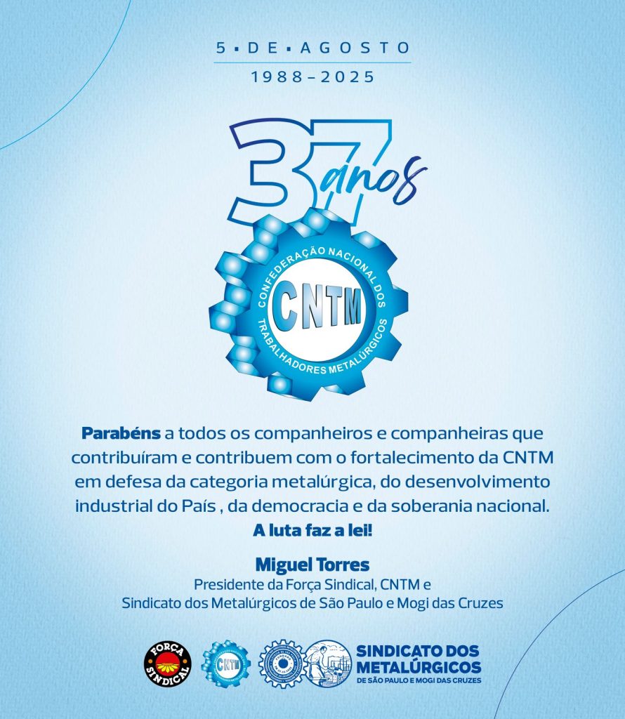 5 de Agosto CNTM 37 anos 1988-2025 Parabéns a todos os companheiros e companheiras que contribuíram e contribuem com o fortalecimento da CNTM em defesa da categoria metalúrgica, do desenvolvimento industrial do País , da democracia e da soberania nacional. A luta faz a lei! Miguel Torres, presidente da CNTM, Força Sindical e Sindicato dos […]