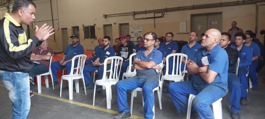 DIRETOR ÉRLON, COM A PRESENÇA DO BRUNO DA SETOR DE CIPA, DANDO PALESTRA NA EMPRESA HIMILE SOBRE ASSÉDIO MORAL E SEXUAL. COM A PRESENÇA DO JOP EM REUNIÃO COM A EMPRESA SOBRE COMO IMPLANTAR AS METAS DA PLR.
