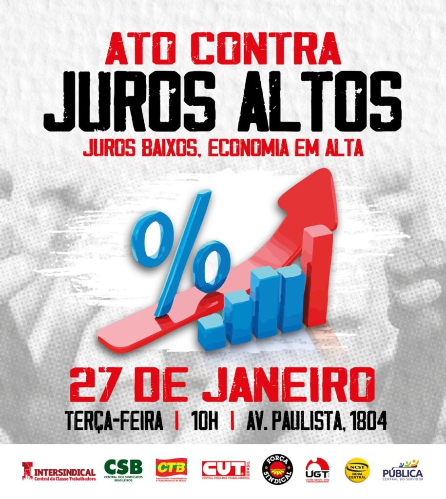 Ato contra os juros altos: nesta terça, 27/01, 10h, em frente ao Banco Central, na Avenida Paulista, 1804, em São Paulo