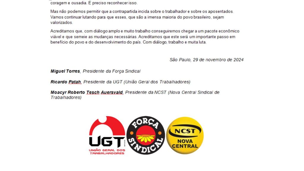 Nota das centrais sindicais: Pacote atende reivindicações dos trabalhadores, mas só em parte Antigas reivindicações do movimento sindical, como a isenção de Imposto de Renda (IR) para quem ganha até R$ 5 mil, foram contempladas no anúncio do pacote econômico feito pelo ministro da Economia Fernando Haddad no dia 27/11. Entretanto existem pontos sensíveis que […]