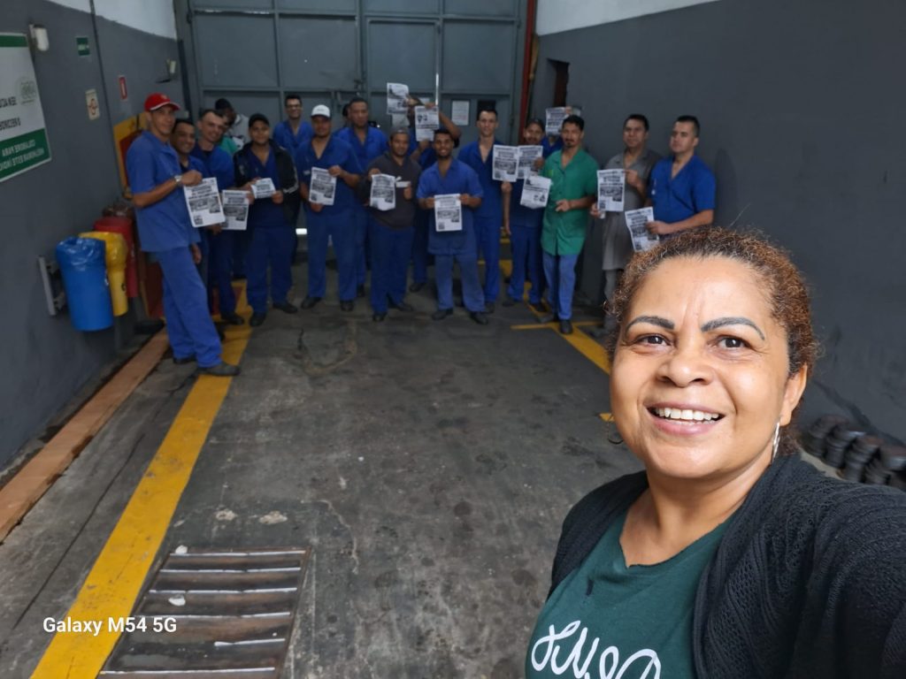 Diretora Sonete na Aro Estamparia convocando pra Assembleia dia 8 no Sindicato #campanhasalarial2024