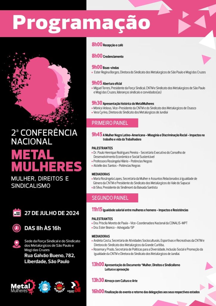 2ª Conferência Nacional MetalMulheres: sábado, 27 julho, sede do Sindicato dos Metalúrgicos de SP e Força Sindical, rua Galvão Bueno, 782, 8 às 16h
