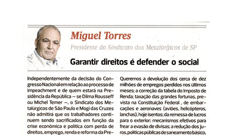 Artigo publicado no Diário de S.Paulo – Edição 20.04.2016 Leia também como nota do Sindicato dos Metalúrgicos de São Paulo e Mogi das Cruzes Garantir direitos é defender o social Independentemente da decisão do Congresso Nacional em relação ao processo de impeachment e de quem estará na Presidência da República – se Dilma ou […]