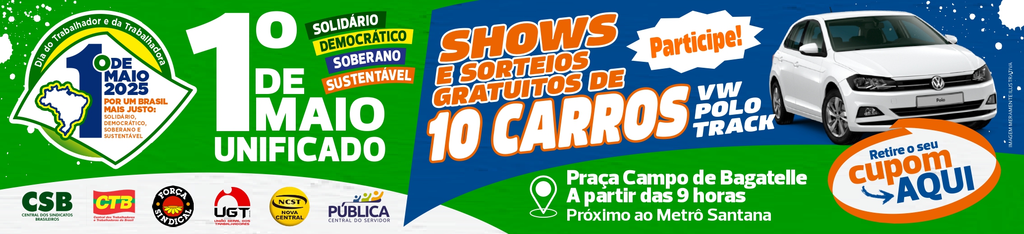 Neste ano, o evento voltará a ser realizado na Praça Campo de Bagatelle, zona norte de São Paulo, dia 1º de maio, quinta-feira, a partir das 9h, com shows e sorteios gratuitos de 10 carrros Zero KM Polo Track Volkswagen e bandeiras de luta, entre elas, a redução da jornada de trabalho, sem redução salarial, e a isenção do imposto de renda para quem ganha até R$ 5 mil.