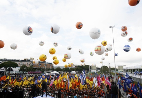SORTEIO DE PRÊMIOS – Dezenas de urnas espalhadas em meio ao público estão coletando os cupons depositados pelos trabalhadores para concorrer a 15 carros e um caminhão de prêmios. Os sorteios ocorrerão ao longo do dia entre as apresentações de artistas e discursos de sindicalistas.