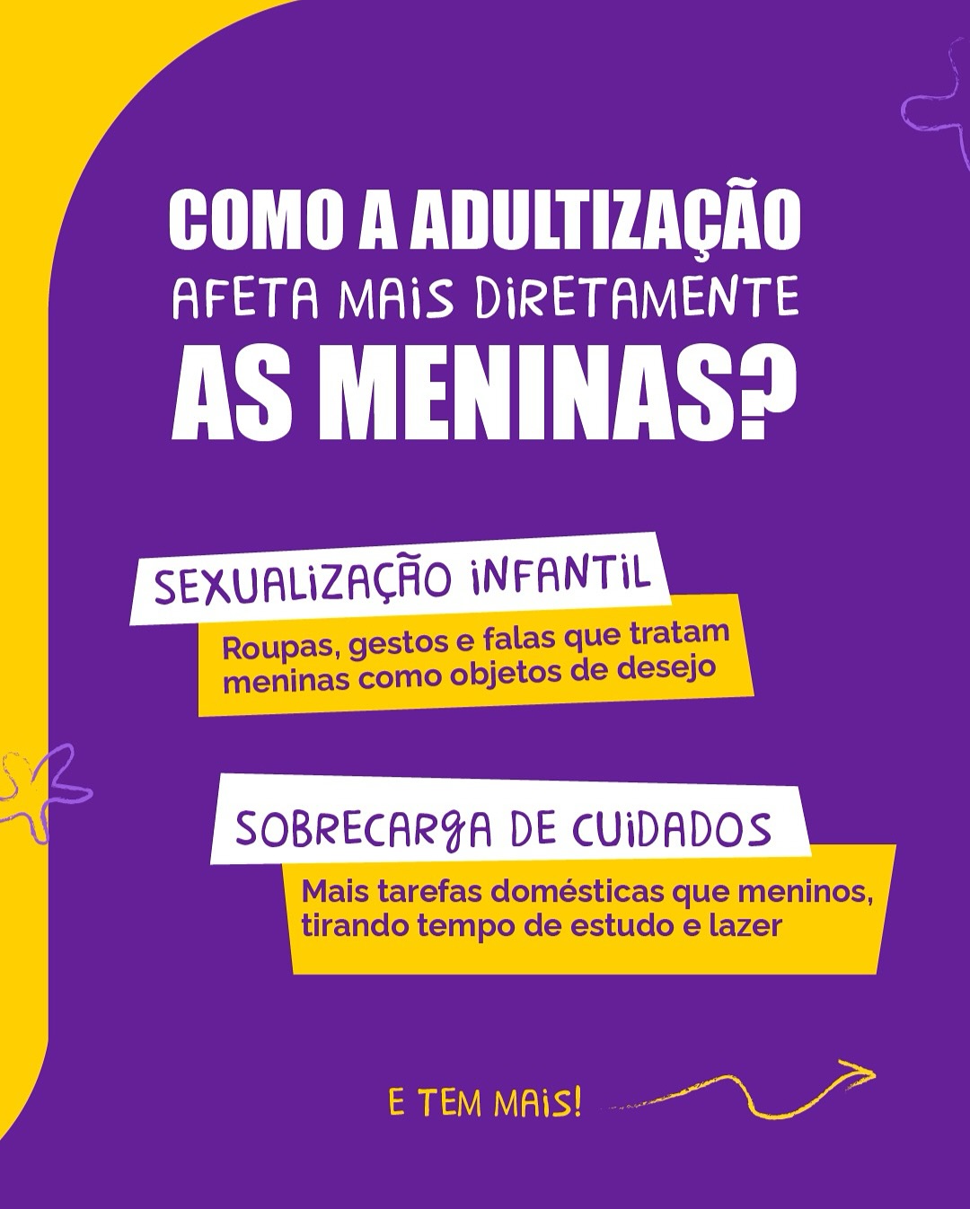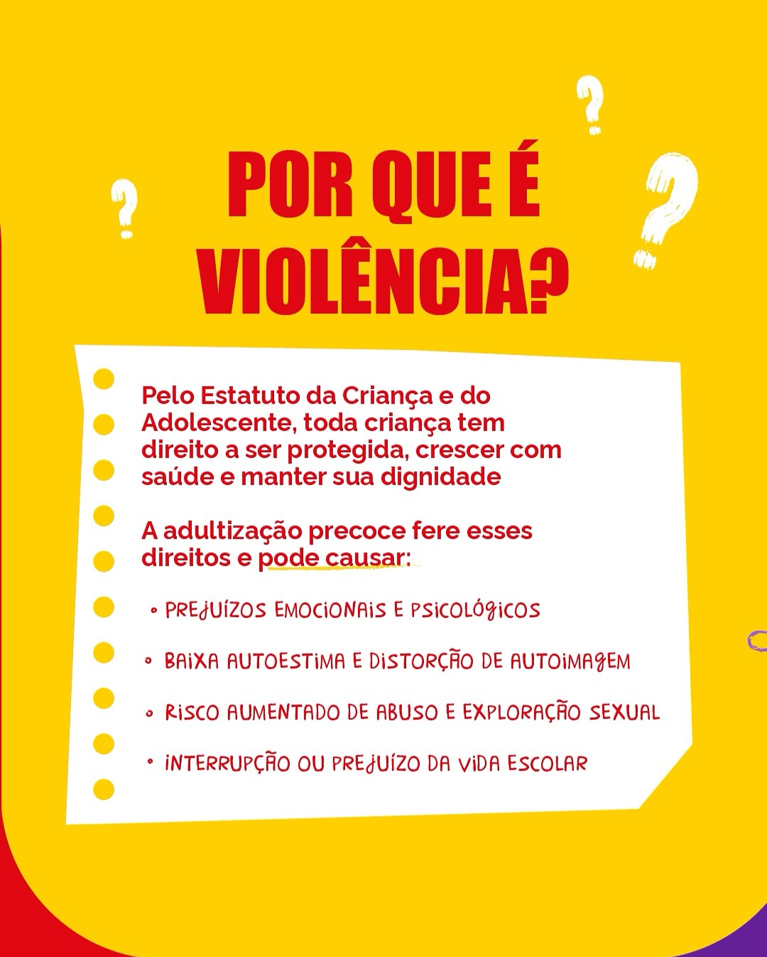 Quando uma criança é exposta à sexualização, sobrecarga de responsabilidades ou pressão estética antes do tempo, estamos negando o seu direito à infância e perpetuando desigualdades de gênero. E é dever do Estado, das famílias e de toda a sociedade garantir proteção, cuidado e um desenvolvimento saudável.