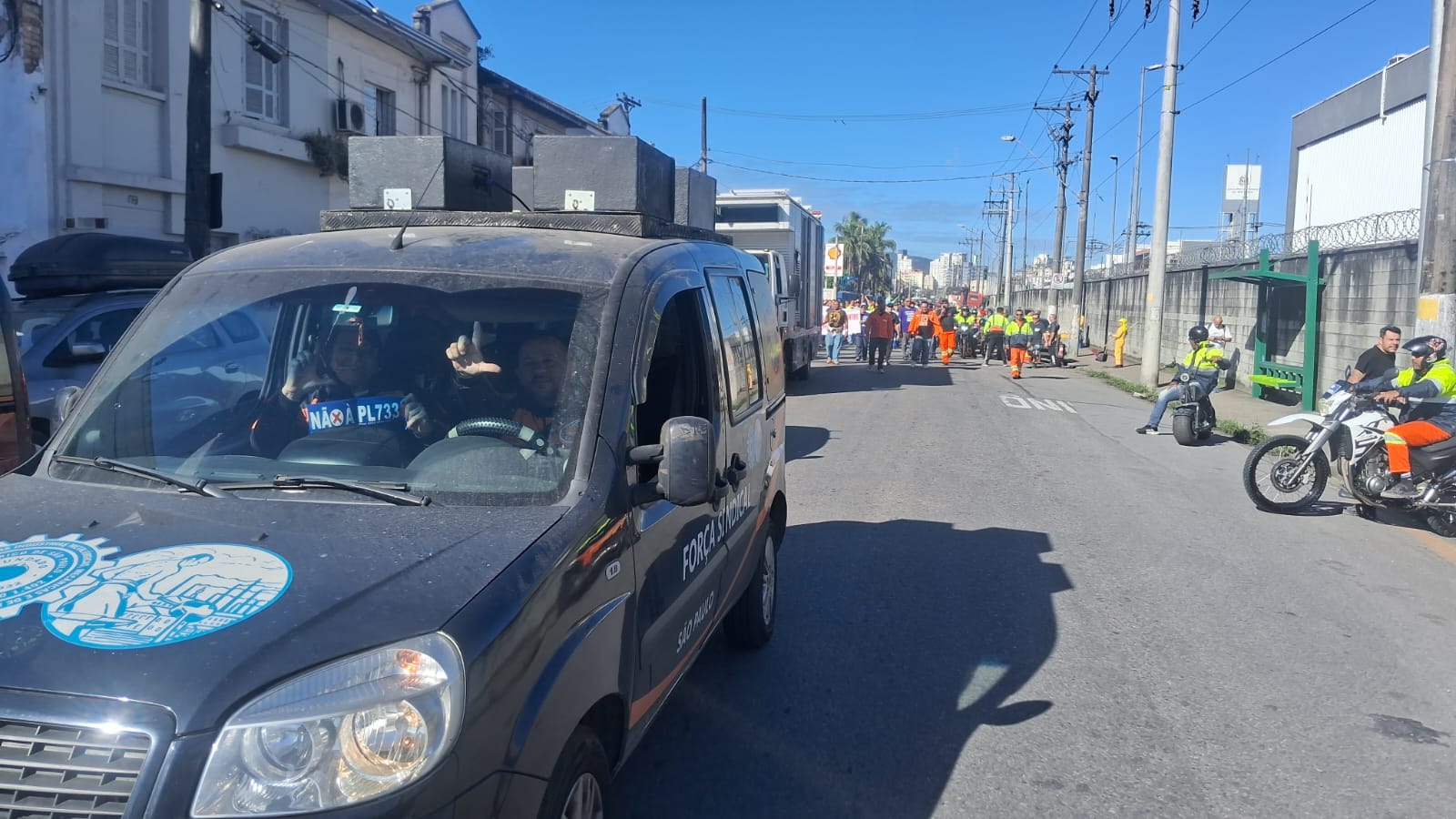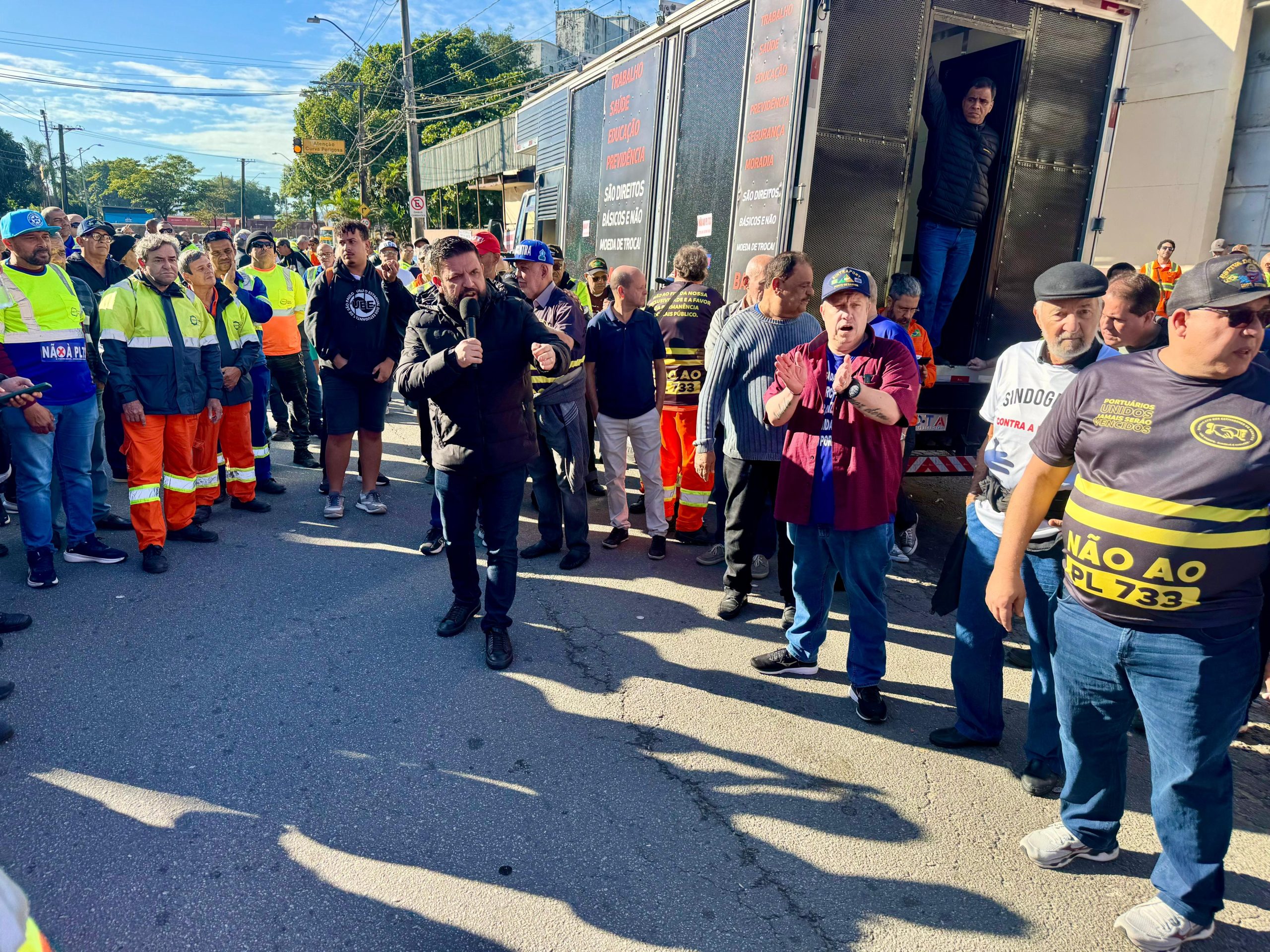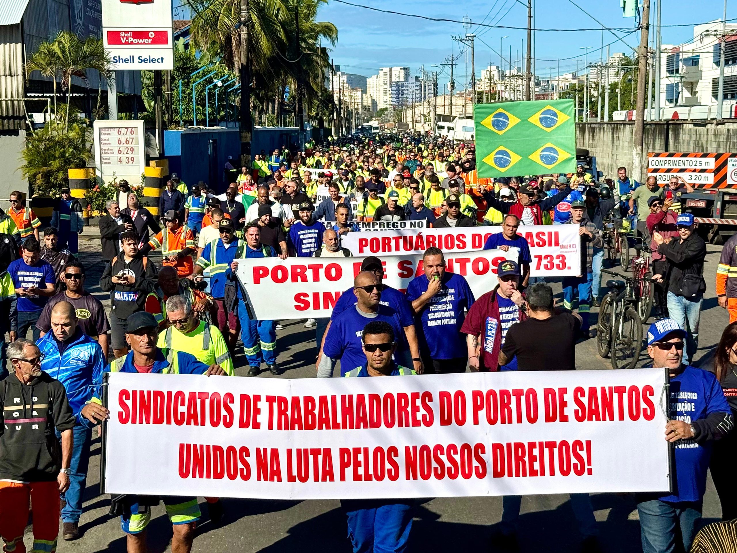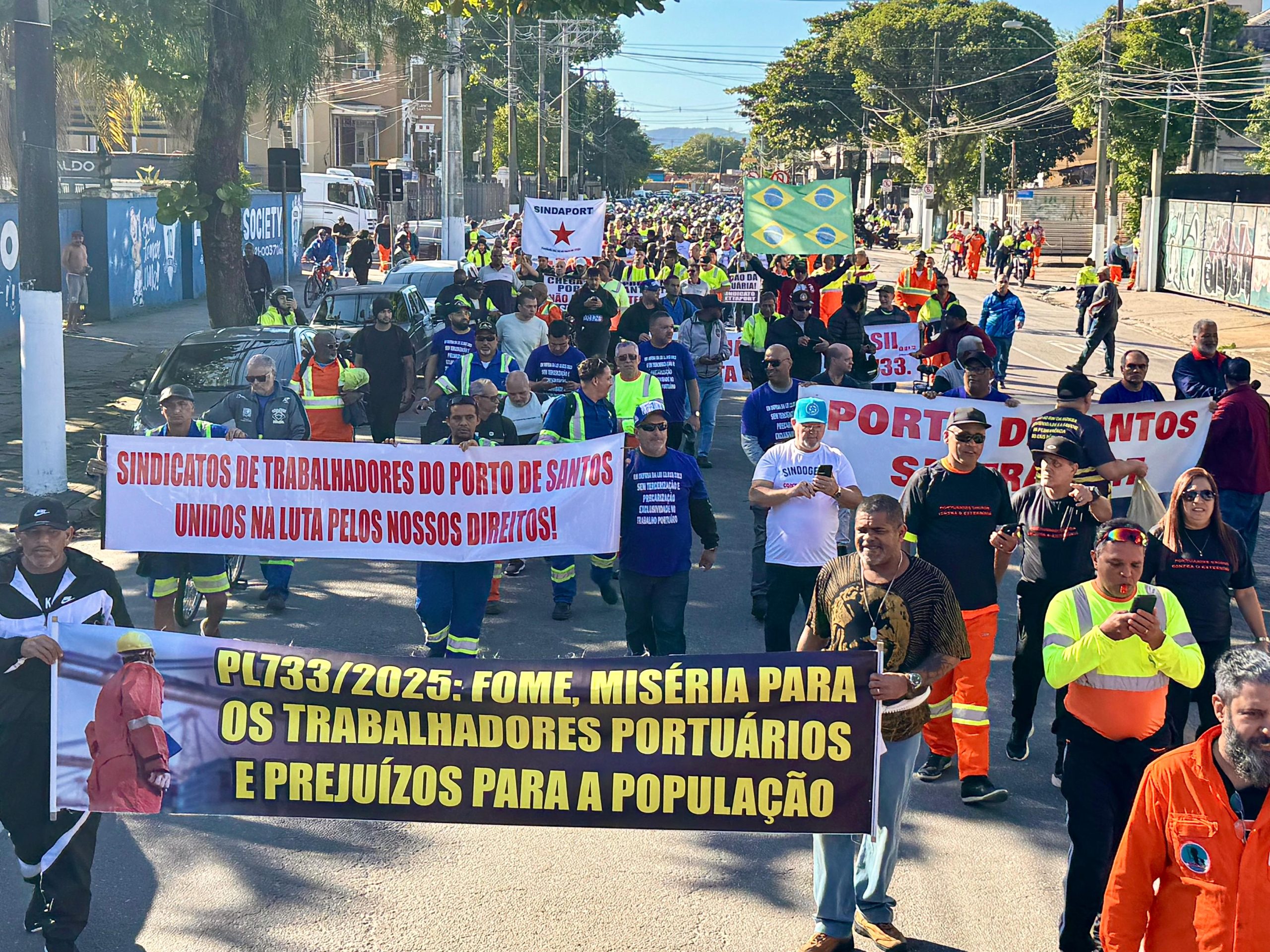 O Sindicato dos Metalúrgicos de São Paulo e Mogi das Cruzes e a Força Sindical, entidades presididas por Miguel Torres, participaram nesta sexta-feira, 13 de junho de 2025, de um protesto no centro de Santos, litoral paulista, dos portuários contra o Projeto de Lei 733/2025, que prevê alterações significativas na regulação do sistema portuário brasileiro, ameaça empregos e direitos e deve afetar toda a economia da Baixada Santista.