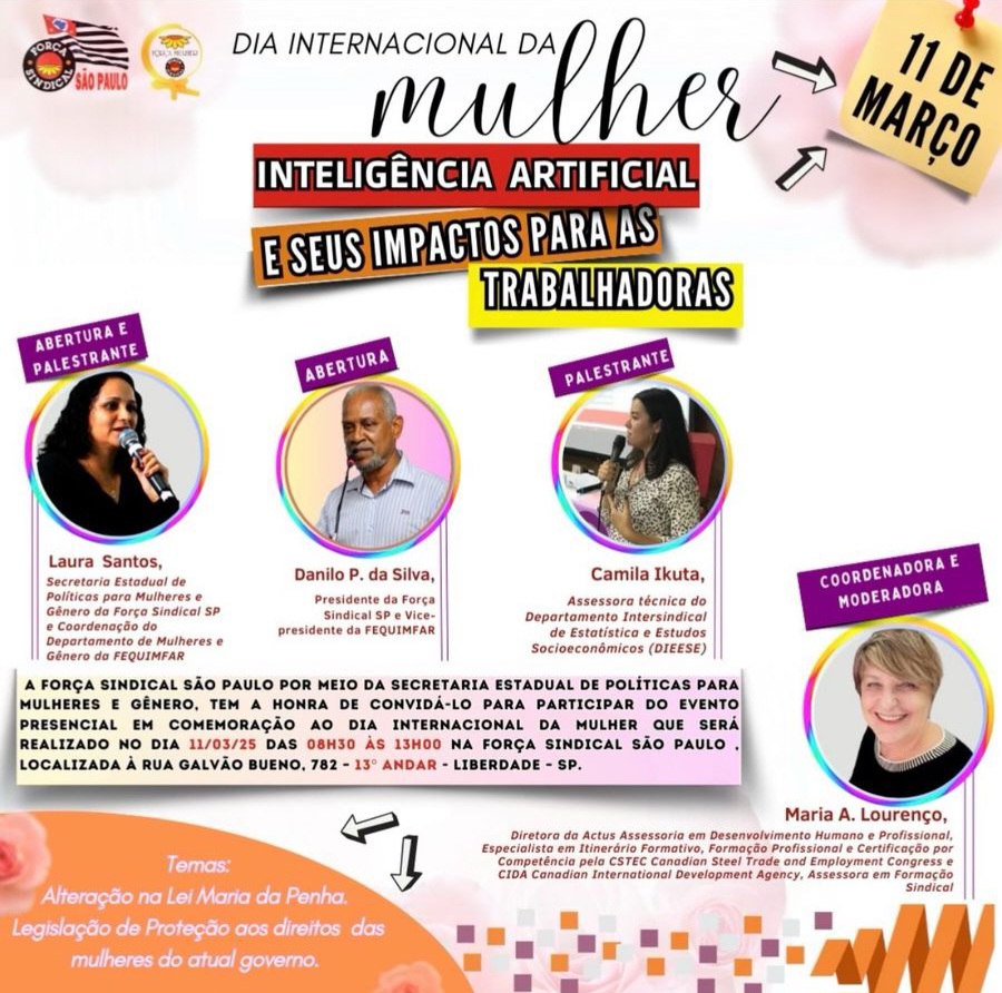 No evento: palestras sobre os impactos da “inteligência artificial” para as trabalhadoras, Lei Maria da Penha e políticas públicas do governo Lula em proteção aos direitos das mulheres.