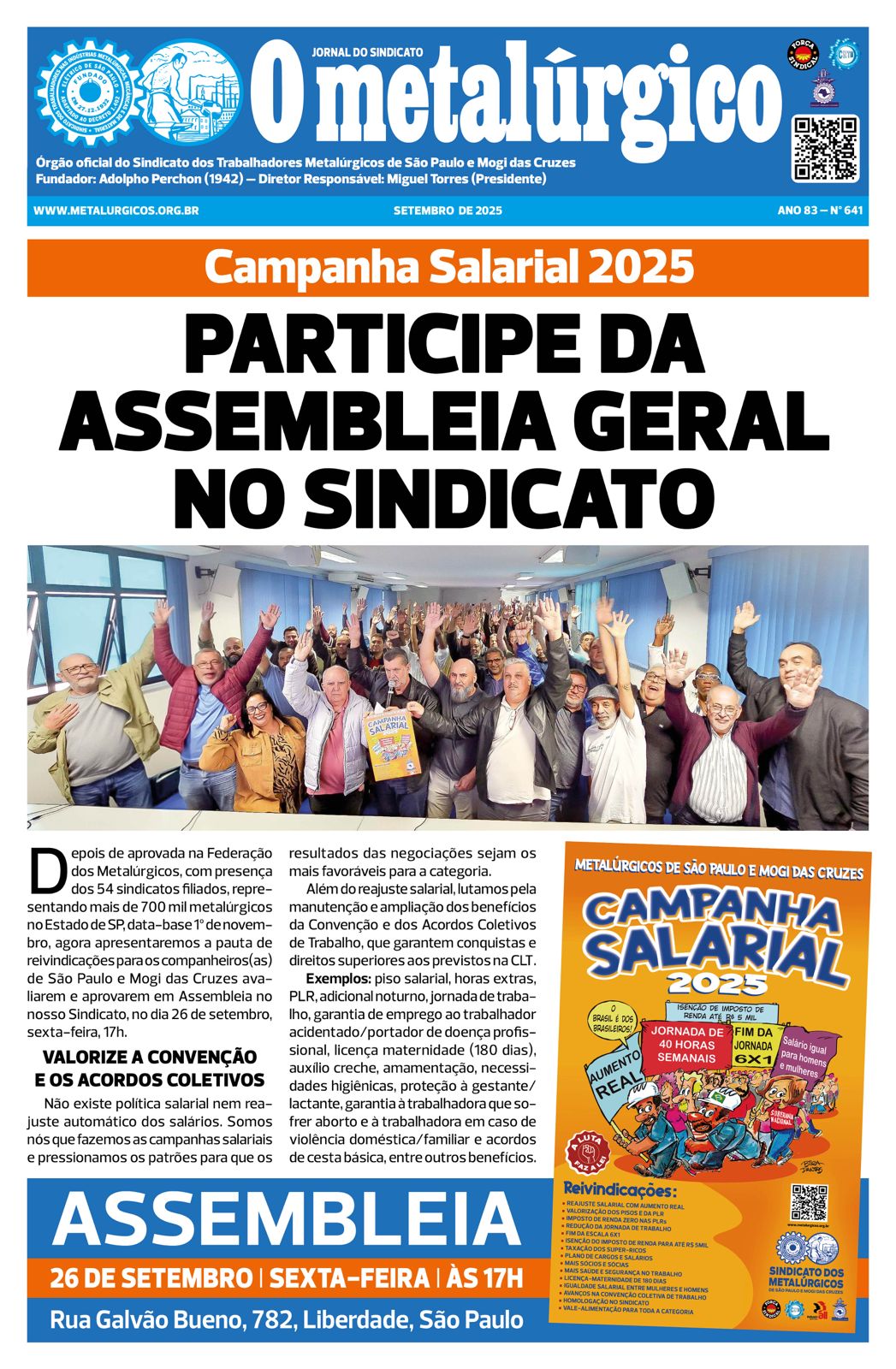 Será na sexta-feira, 26 de setembro de 2025, às 17h, a Assembleia da Campanha Salarial, na sede do nosso Sindicato, Rua Galvão Bueno, 782, Liberdade, próximo ao metrô São Joaquim. Na ocasião, vamos apresentar para a nossa categoria a pauta de reivindicações aprovada pelos 54 sindicatos filiados à Federação dos Metalúrgicos, representando mais de 700 mil metalúrgicos no Estado de SP, data-base 1º de novembro.