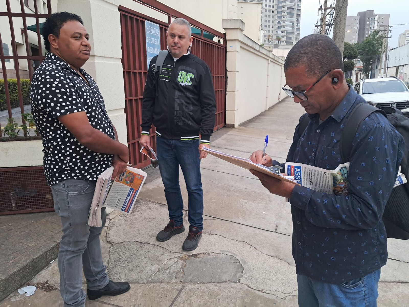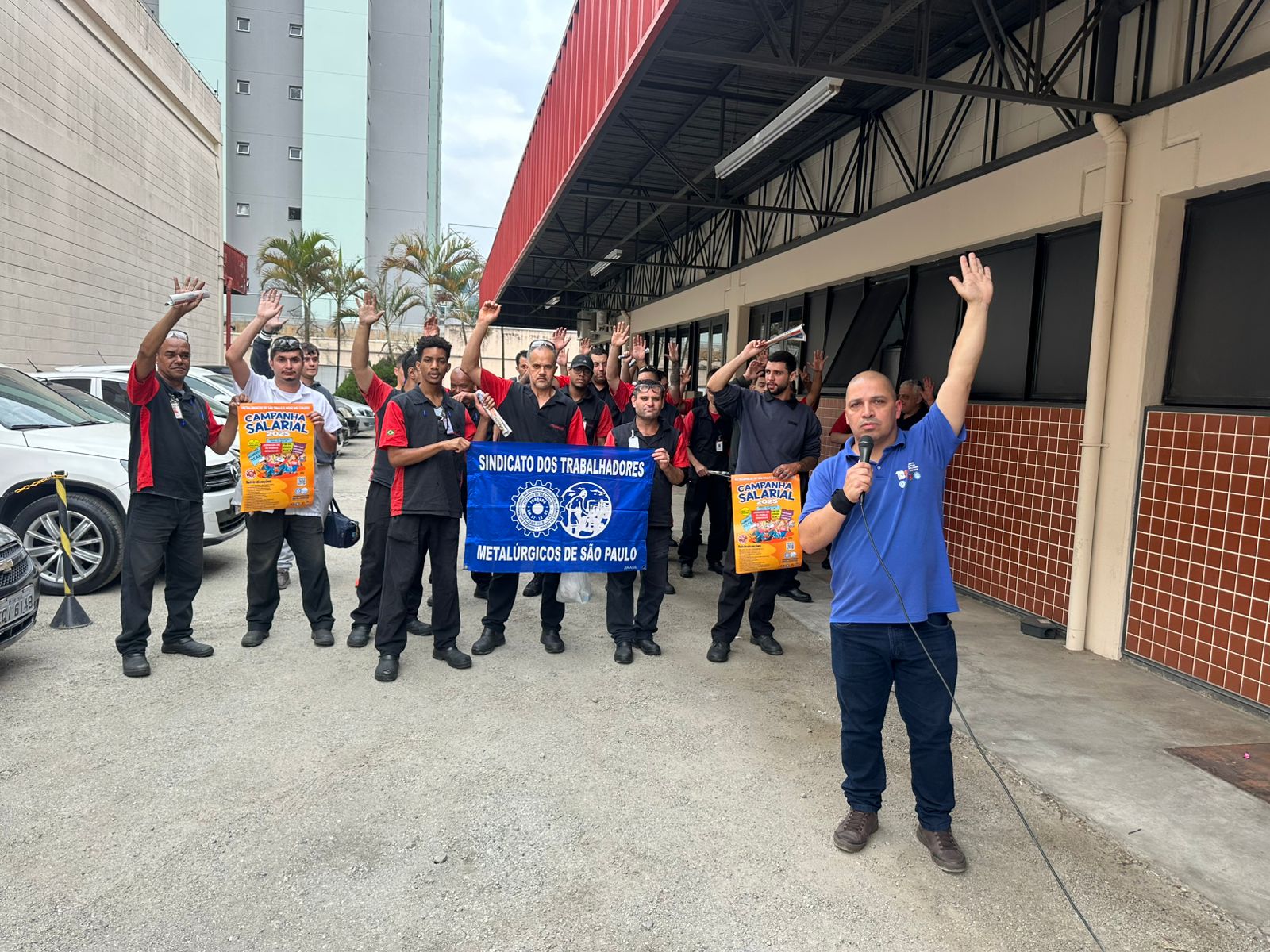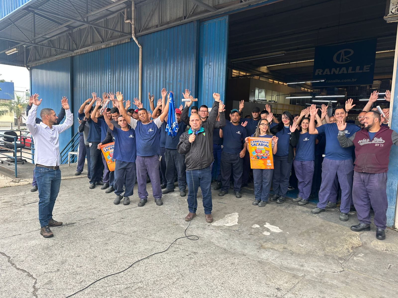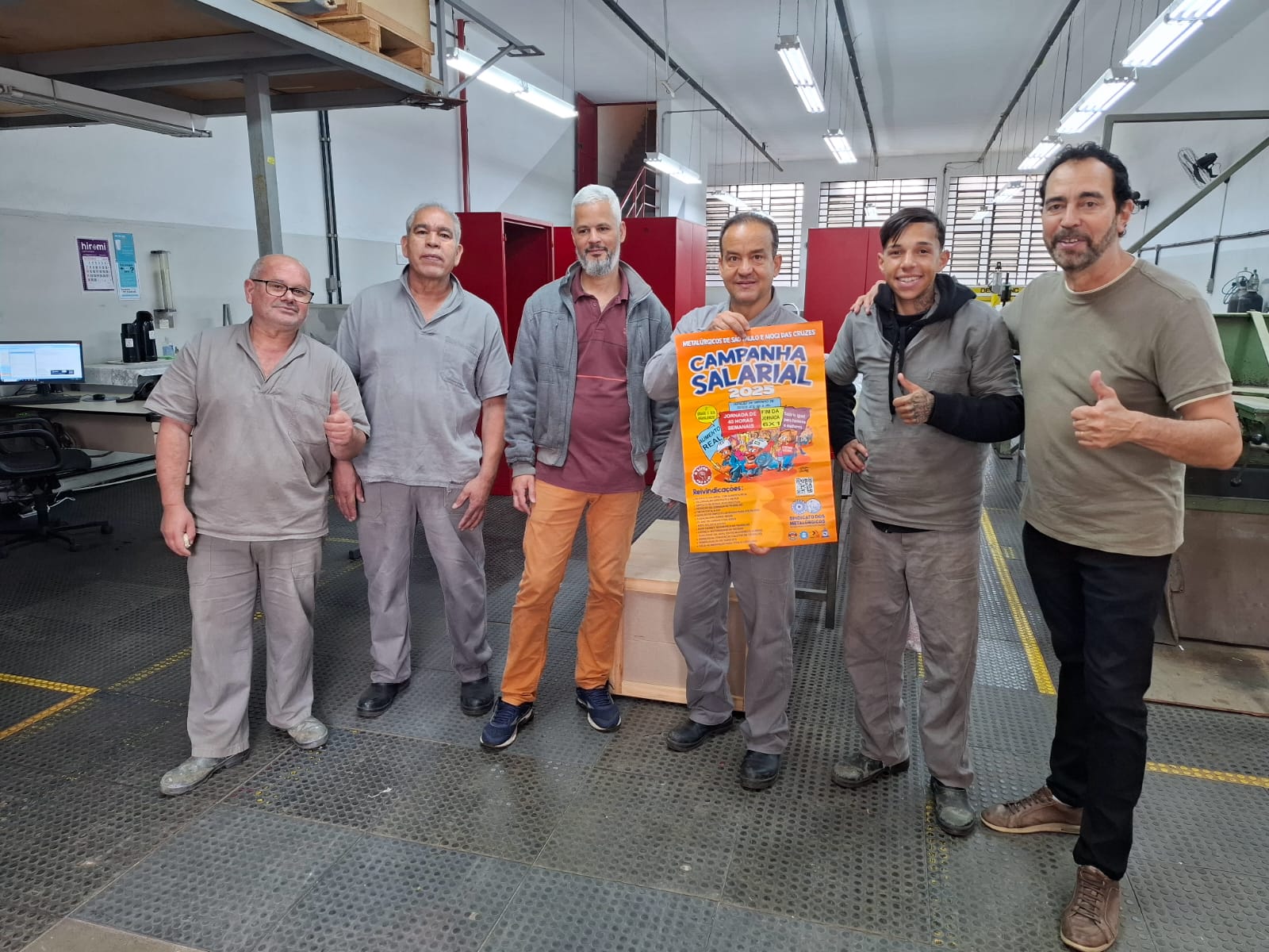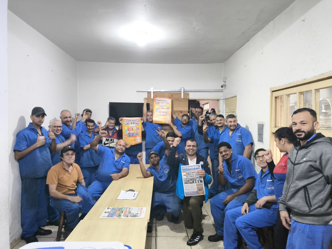 Ação Comunicativa – o Sindicato produziu cartaz, jornal o Metalúrgico e faixa e tem feito encontros diários com os trabalhadores de mobilização nas fábricas, divulgando a Assembleia e as reivindicações da campanha salarial 2025.