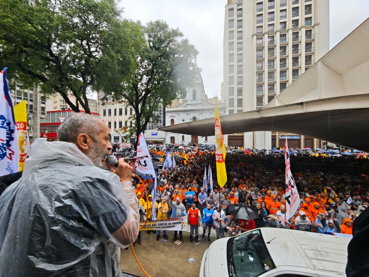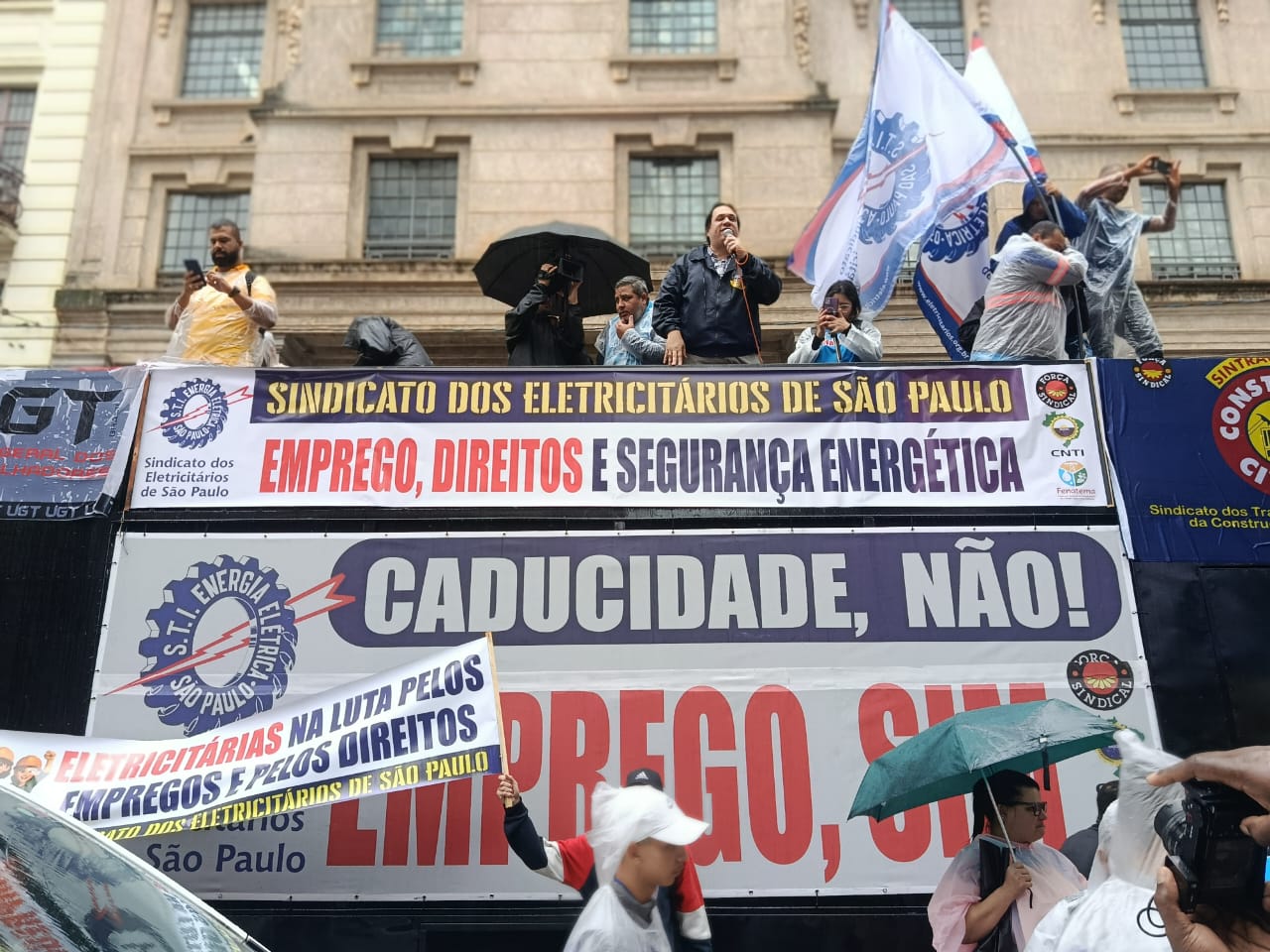 Foi realizado nesta quinta, 12 de março de 2026, na Praça do Patriarca, centro de São Paulo, um ato dos trabalhadores do setor elétrico em defesa dos empregos e da continuidade do serviço de energia elétrica no estado de São Paulo. A mobilização foi organizada pelo Sindicato dos Eletricitários de São Paulo e contou com a participação de outras entidades sindicais, entre elas o Sindicato dos Metalúrgicos de São Paulo e Mogi das Cruzes e a Força Sindical.