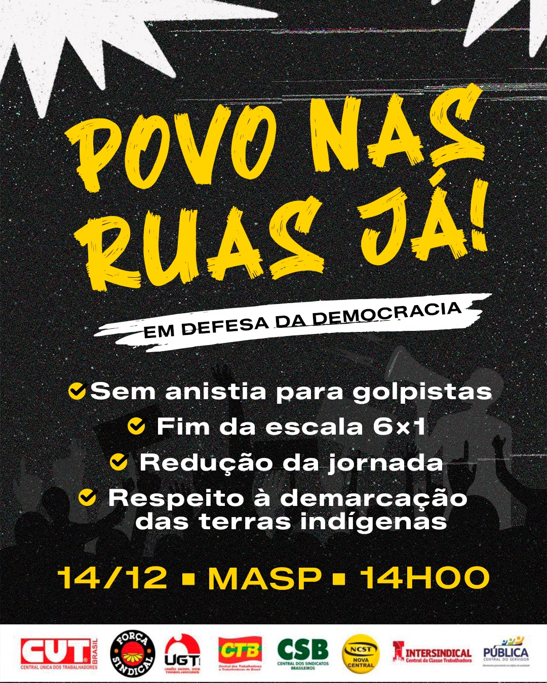 As centrais sindicais e os movimentos sociais convocam todos(as) para participarem dos atos que acontecerão neste domingo, 14 de dezembro de 2025, em todo o Brasil, em defesa da democracia, da redução da jornada de trabalho (sem redução salarial), do fim da escala 6×1 e em respeito à demarcação das terras indígenas.