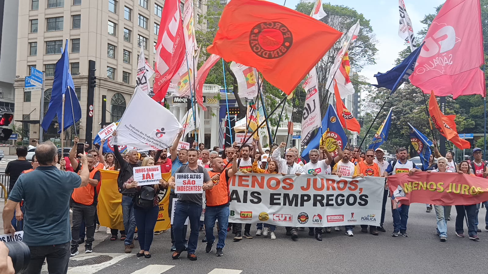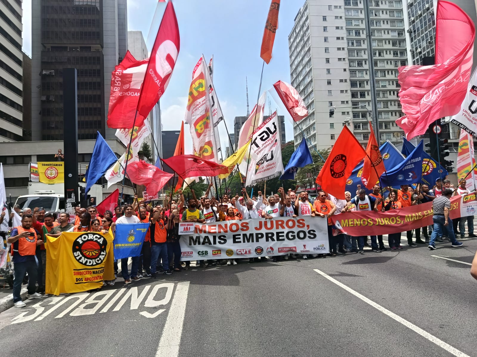 Centrais sindicais protestam na Avenida Paulista, em São Paulo, e cobram do Copom (Banco Central) a queda imediata da Selic para estimular consumo, produção e empregos no País.