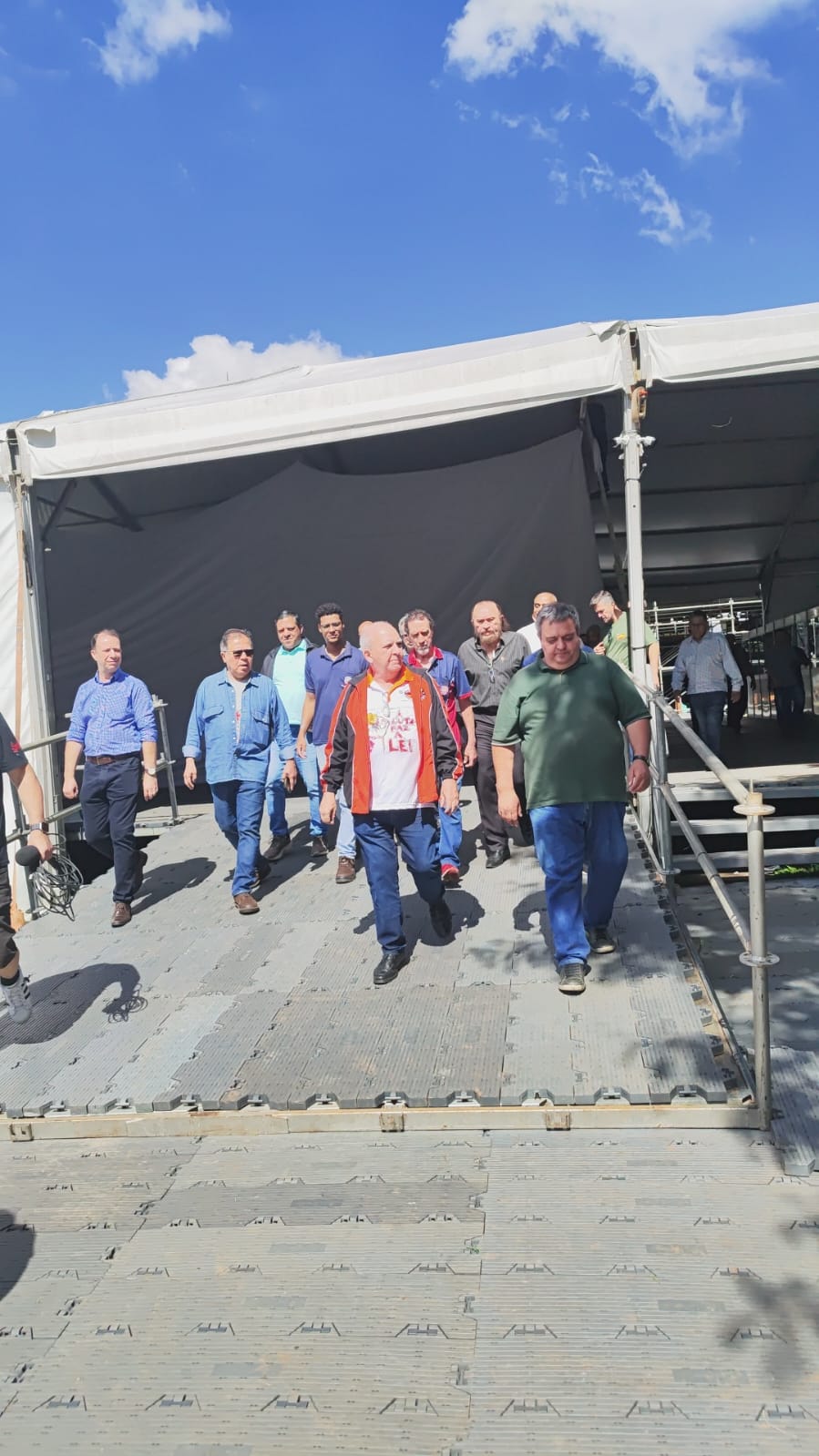 Dirigentes das centrais sindicais, entre eles o presidente da Força Sindical, Miguel Torres, o secretário-geral João Carlos Gonçalves, o Juruna, e o secretário de relações sindicais Geraldino dos Santos visitaram o palco do 1º de Maio de 2025, na Praça Campo de Bagatelle, zona norte de São Paulo.