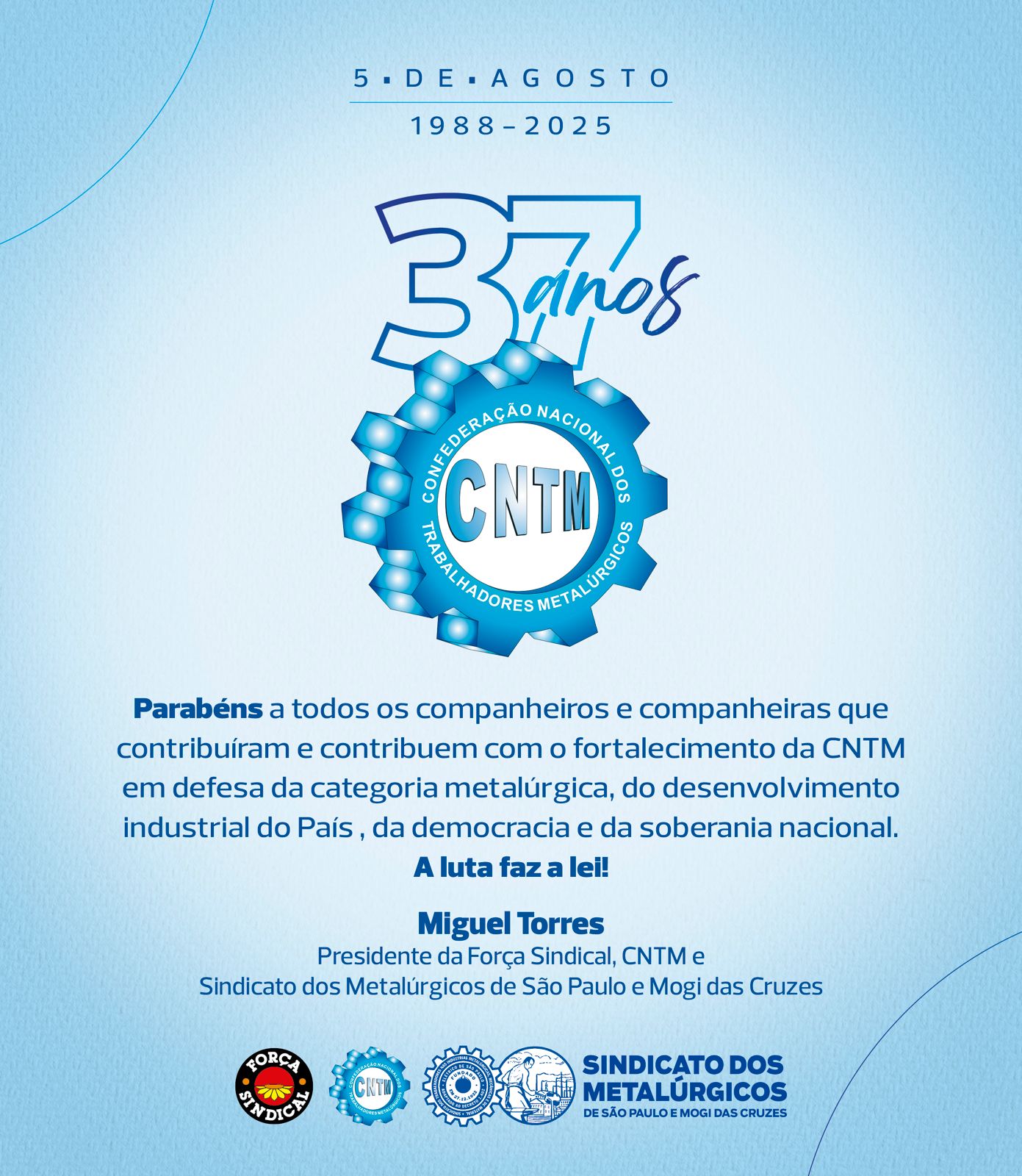 Parabéns a todos os companheiros e companheiras que contribuíram e contribuem com o fortalecimento da CNTM em defesa da categoria metalúrgica, do desenvolvimento industrial do País , da democracia e da soberania nacional.