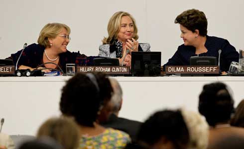 Ao lado da secretária de Estado norte-americana, Hillary Clinton, e da diretora-executiva da ONU Mulher (entidade que defende a igualdade de gêneros), Michelle Bachelet, a presidente da República destacou sua participação, na próxima quarta-feira, no discurso de abertura da Assembleia Geral da ONU. “Depois de amanhã, serei a primeira mulher nos debates da Assembleia Geral das Nações Unidas. Gostaria de compartilhar esta honra com todas as mulheres que estão aqui presentes, em especial com a secretária Michelle Bachelet, primeira mulher na América do Sul a ser eleita presidente do seu país”.
