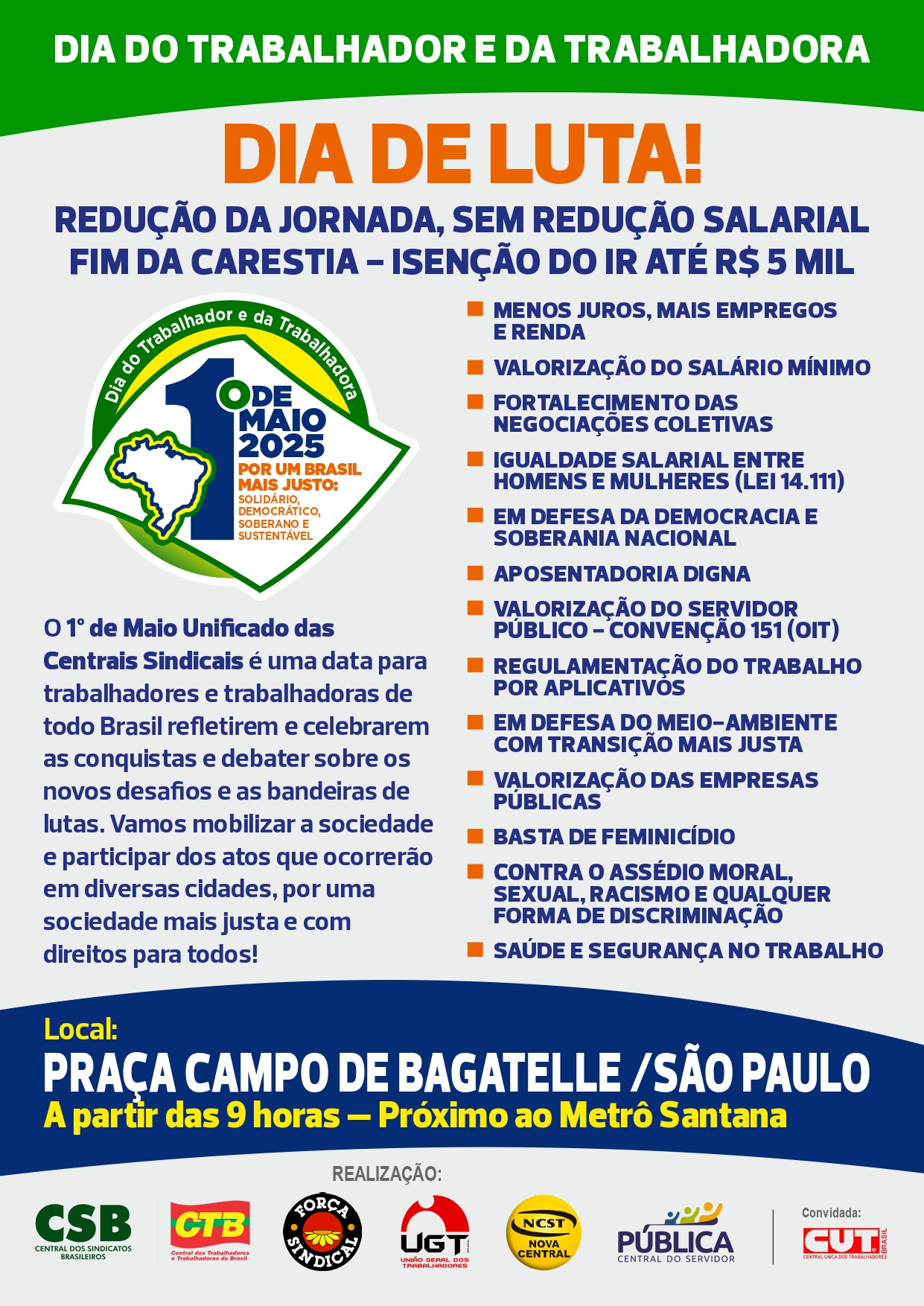 Artistas confirmados no 1º de Maio 2025 na Praça Campo de BagatelleRetire na sede do Sindicato dos Metalúrgicos de São Paulo/Força Sindical, Rua Galvão Bueno, 782, Liberdade, o cupom para participar dos sorteios.