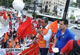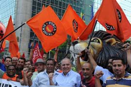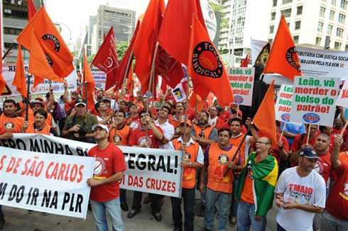 A Avenida Paulista, centro financeiro de São Paulo, foi palco na manhã desta quinta-feira (22) de uma grande manifestação unificada de metalúrgicos, bancários, petroleiros, eletricitários, químicos contra o desconto do Imposto de Renda na PLR (Participação nos Lucros ou Resultados), abonos salariais e adicional de férias dos trabalhadores. As agências bancárias da região permaneceram fechadas até meio-dia, em adesão à campanha dos sindicatos, da Força Sindical e da CUT, pela PLR sem imposto.